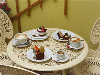příjemné klima a stín. Projděte se naší 3D prohlídkou skrz cukrárnu až do naší klidné zahrádky.